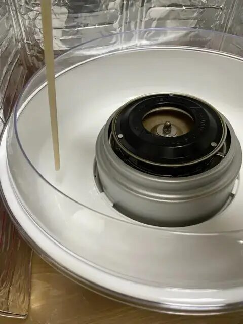 それ以上になると、中央部分(赤い矢印)などの中が少しベタついてくるので、出てきたわたあめが、その部分について、うまく作れないので、作る数量が多い場合は、1度綺麗に掃除してから作るようにしましょう。
