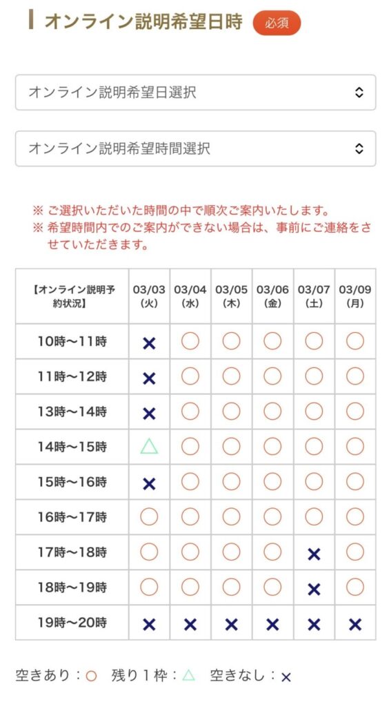 オンライン説明の希望日時、オンライン相談で聞きたい事を入力します。
