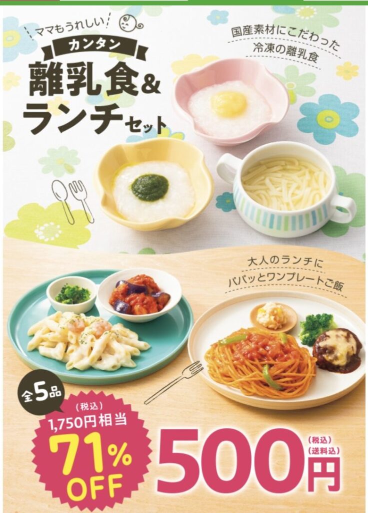 子供の成長に合わせて使える冷凍離乳食とママのランチが5品セットになっています。