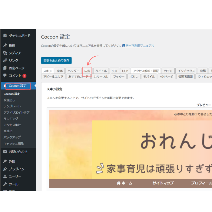初めは、違うテーマが設定されているので「Cocoon」を設定していきましょう。